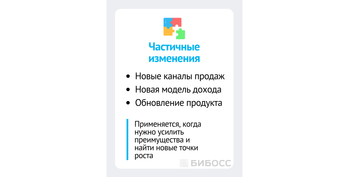 - Частичные изменения — предприниматель изменяет отдельные блоки. Например, добавляет новые каналы продаж или вводит новую систему монетизации — подписка, вместо разовых продаж.