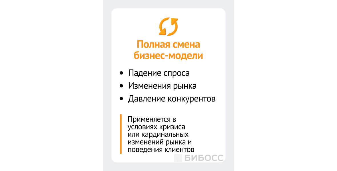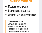 - Полная смена бизнес-модели — применяется в случаях, когда действующая модель бизнеса перестала быть эффективной — падает потребительный спрос, рынок меняется структурно или конкуренты вытесняют бизнес.