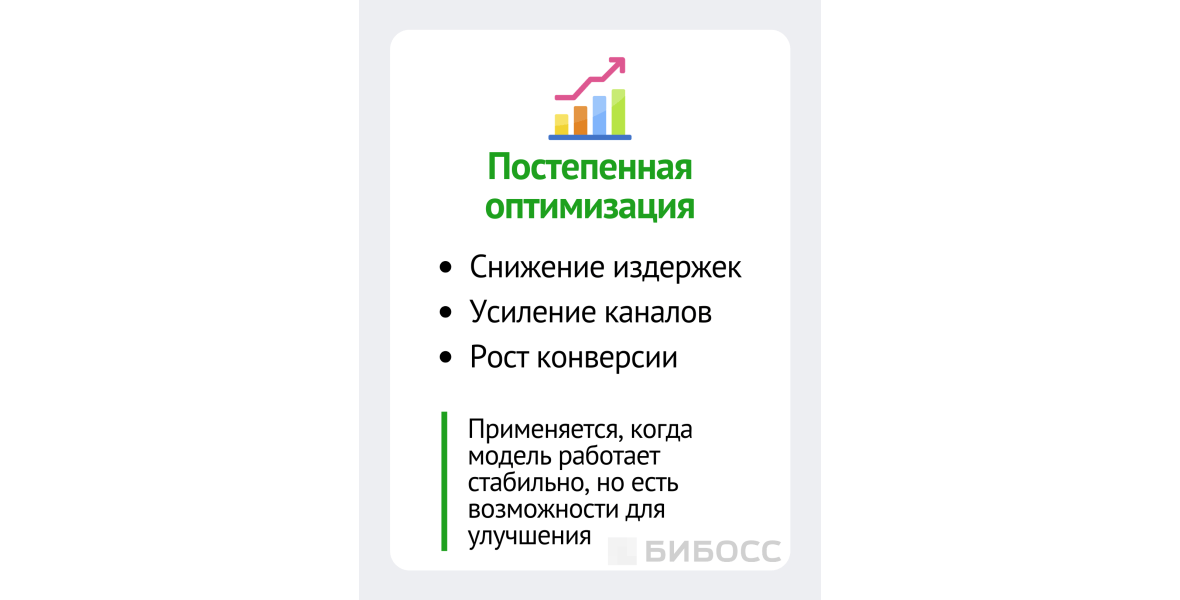 - Постепенная оптимизация — предприниматель сохраняет действующую модель бизнеса, модернизирует лишь отдельные её элементы. Например, сокращает издержки, усиливает каналы продаж, повышает конверсию бизнеса.