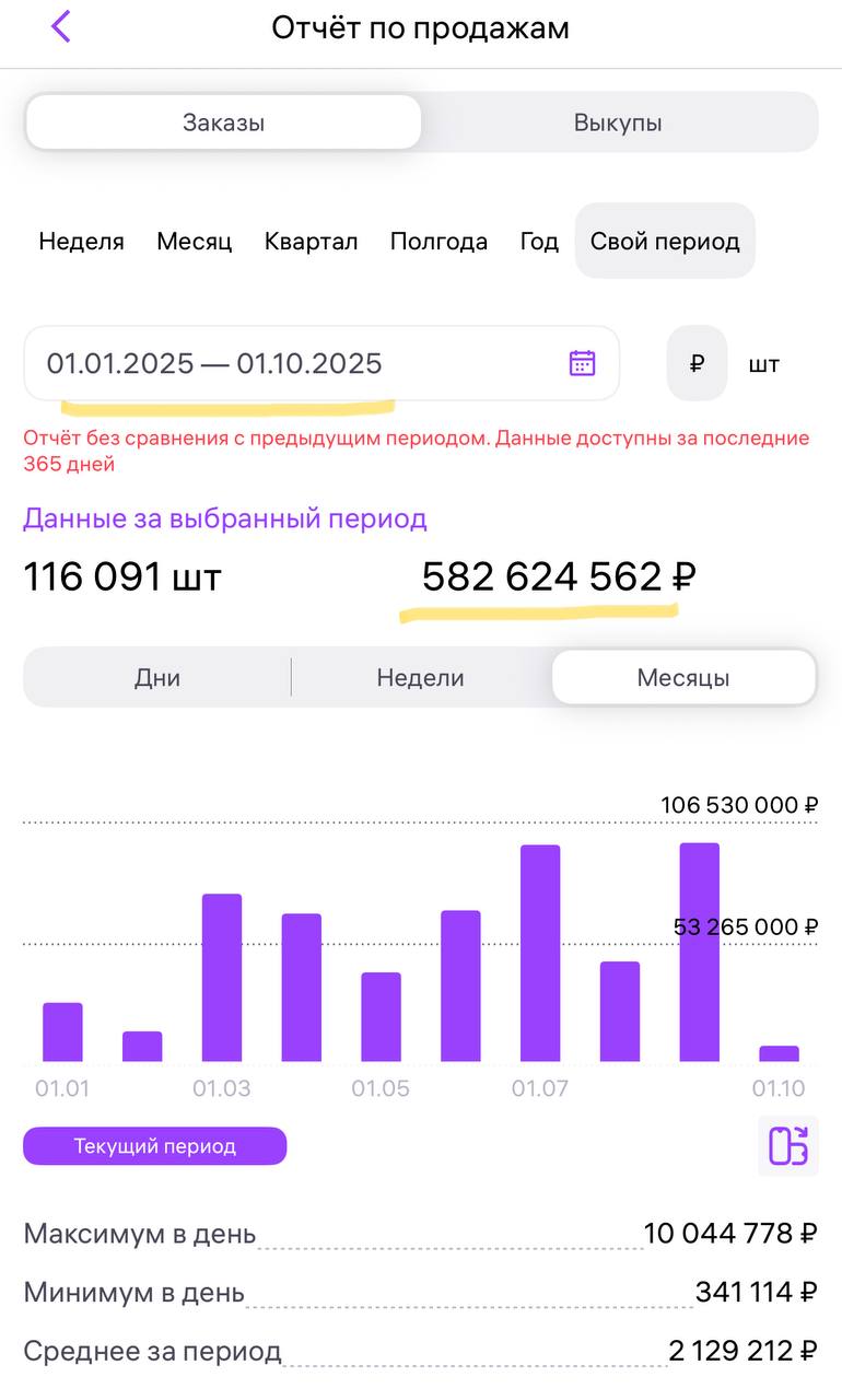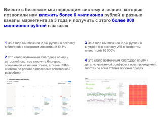 - Вложено 2,5 млн ₽ во внутреннюю рекламу Wildberries с возвратом инвестиций 10 000%.