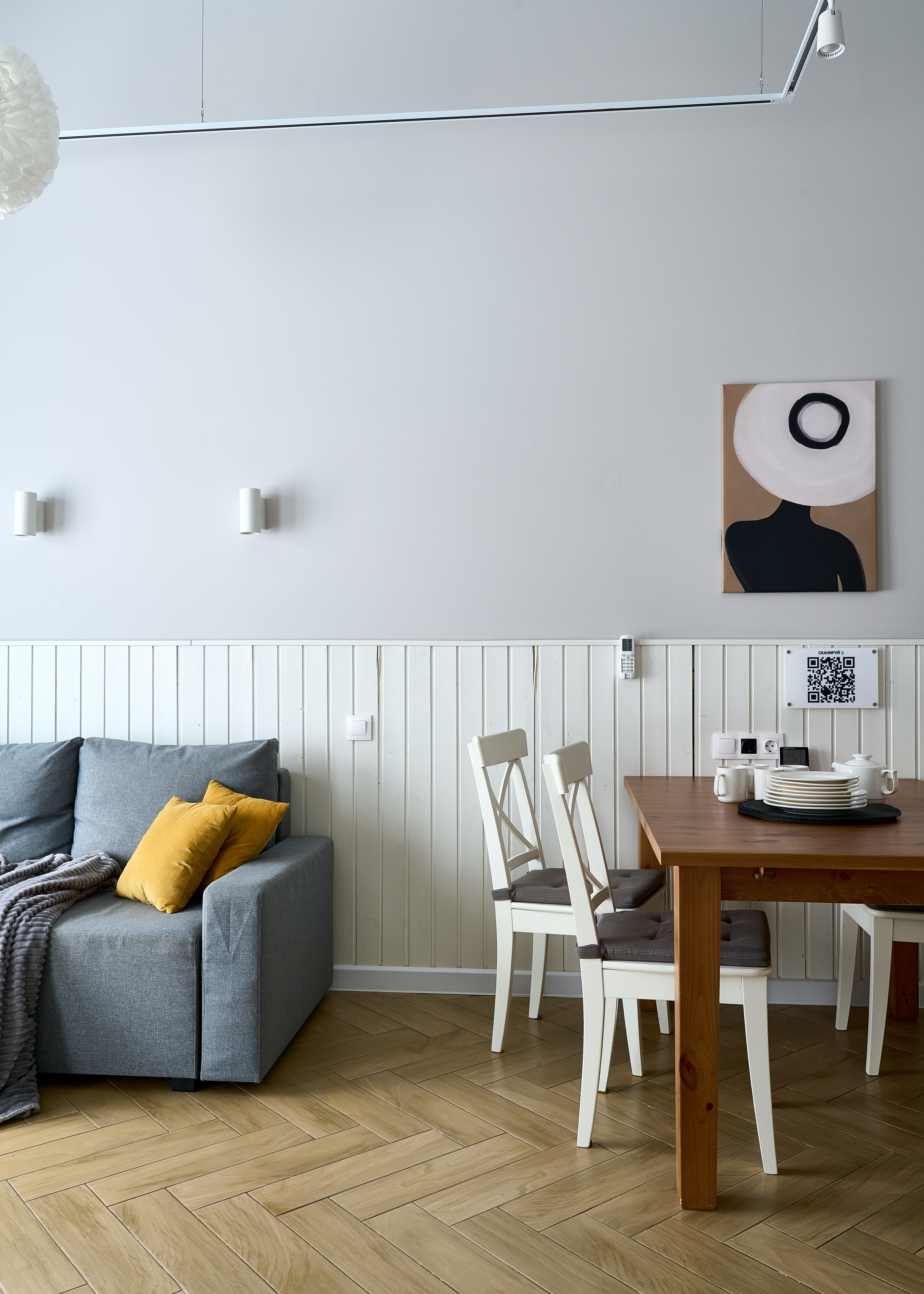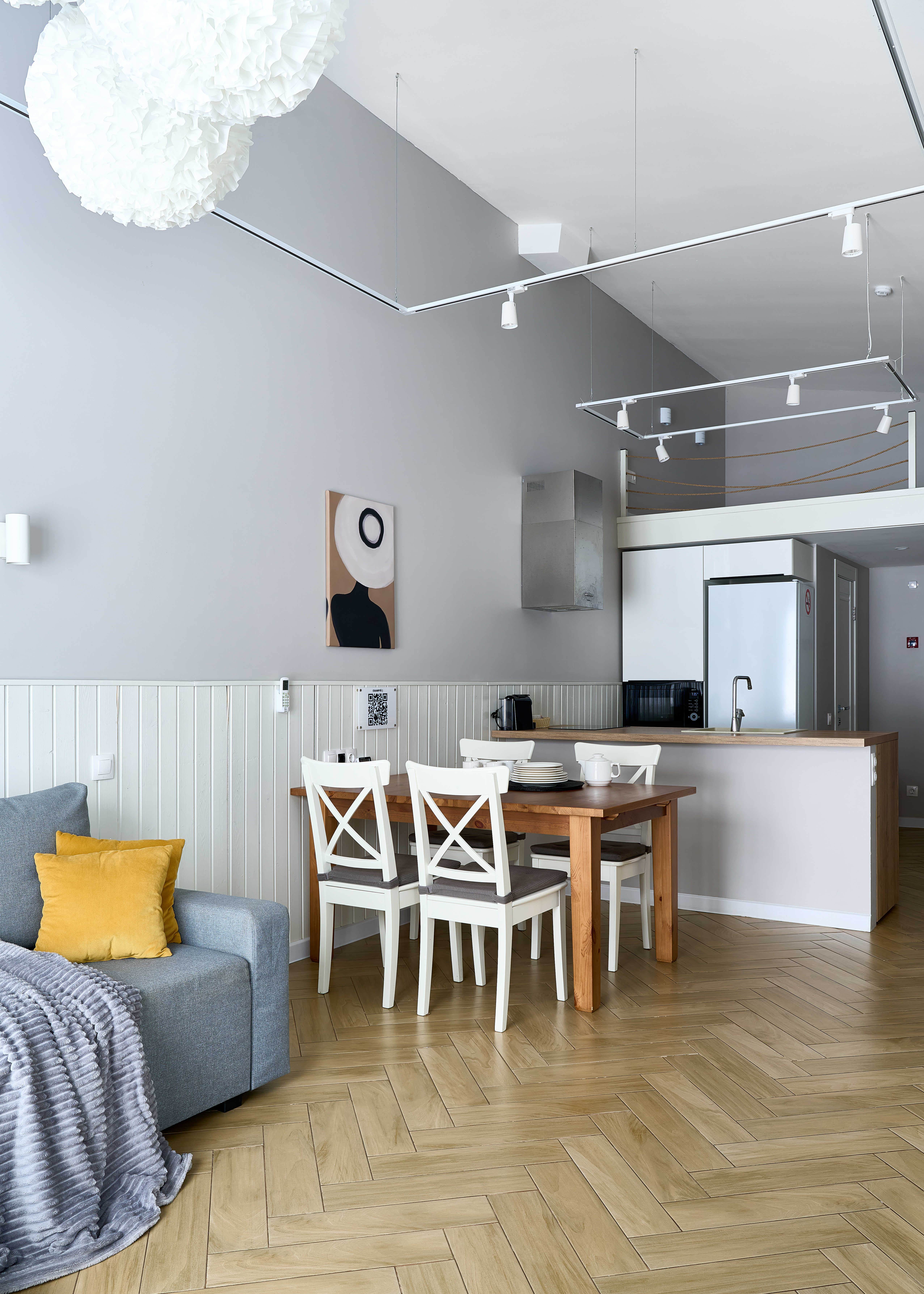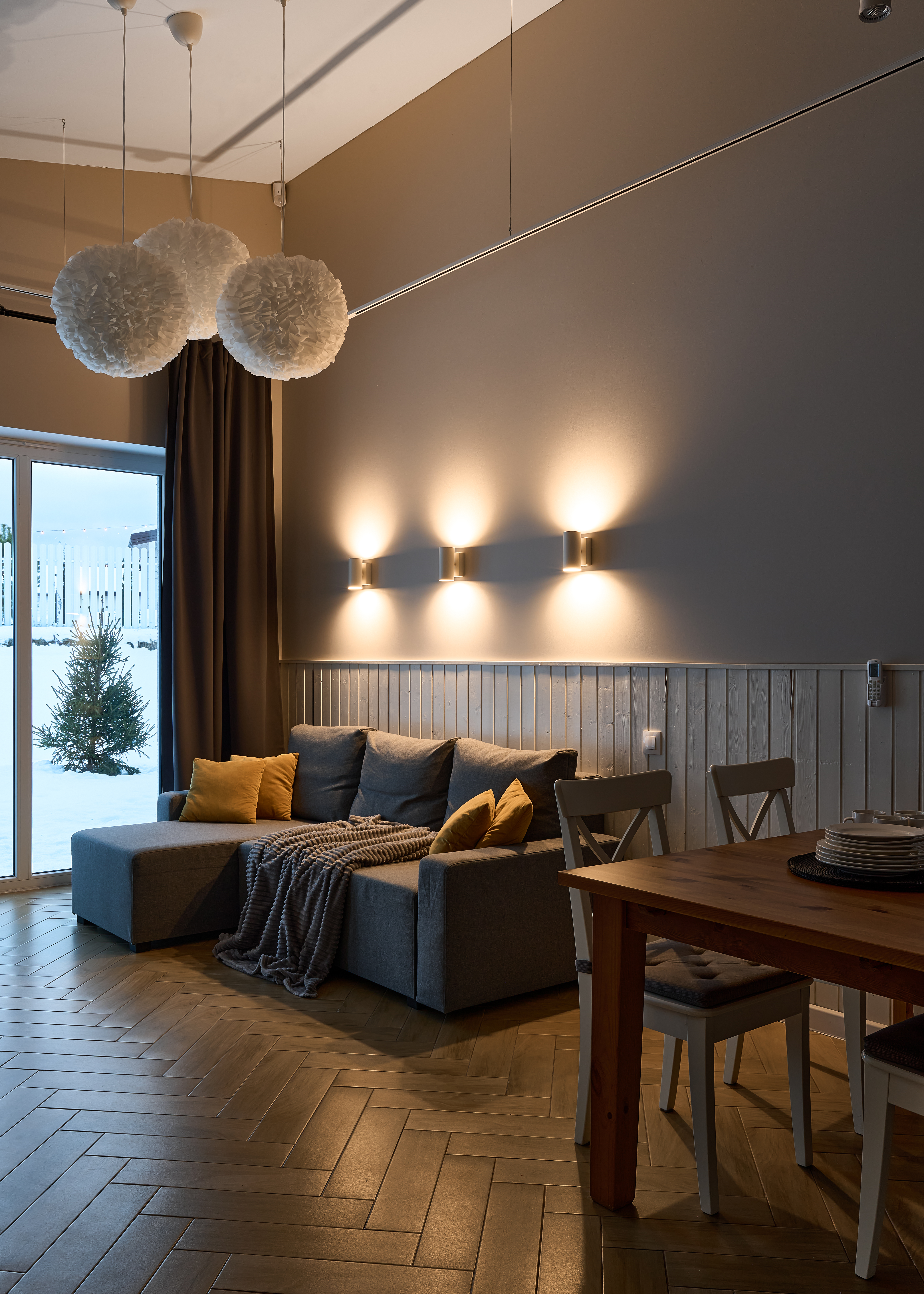 Каждый апартамент состоит из гостинной, 2-х спален, 2-х санузлов, сауны, 2-х террас. Инженерия - отопление водяные теплые полы, бойлер ГВС+ХВС, приточно-вытяжная вентиляция, дизайнерский ремонт и освещение. Фундамент - утепленная плита - 300 мм с подбетонкой и песчаным основанием.