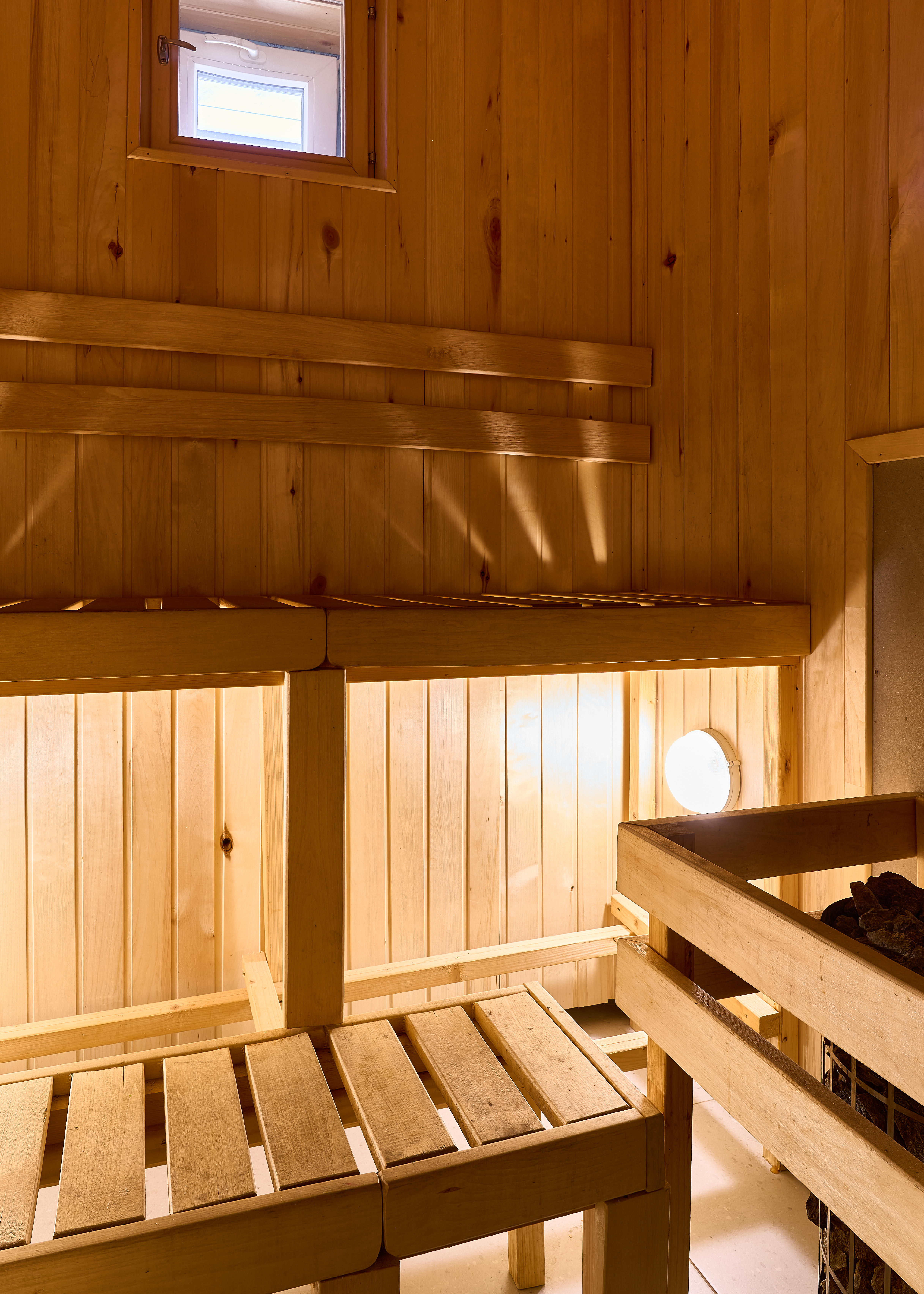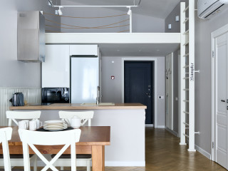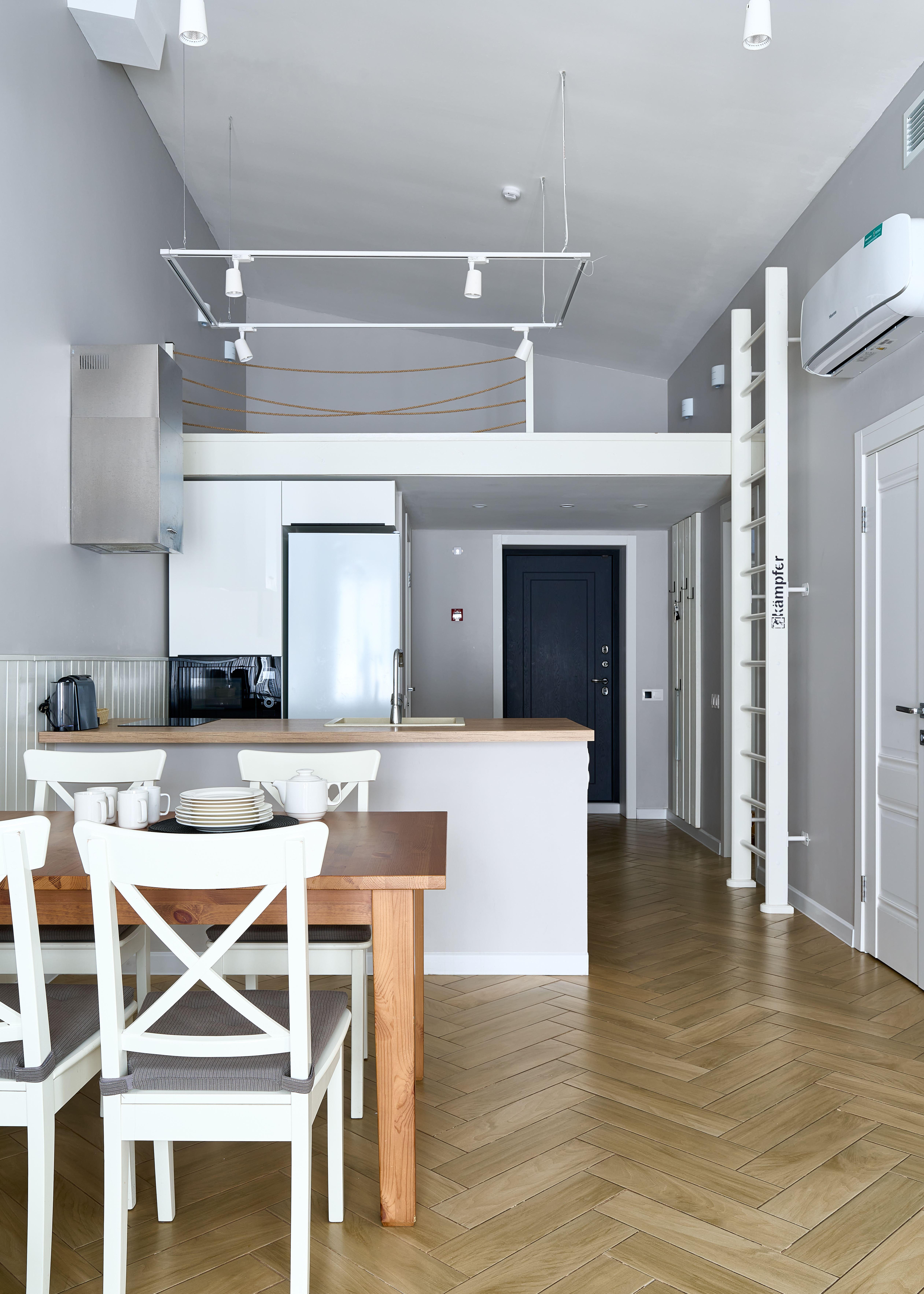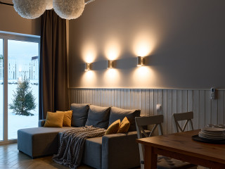 Каждый апартамент состоит из гостинной, 2-х спален, 2-х санузлов, сауны, 2-х террас. Инженерия - отопление водяные теплые полы, бойлер ГВС+ХВС, приточно-вытяжная вентиляция, дизайнерский ремонт и освещение.