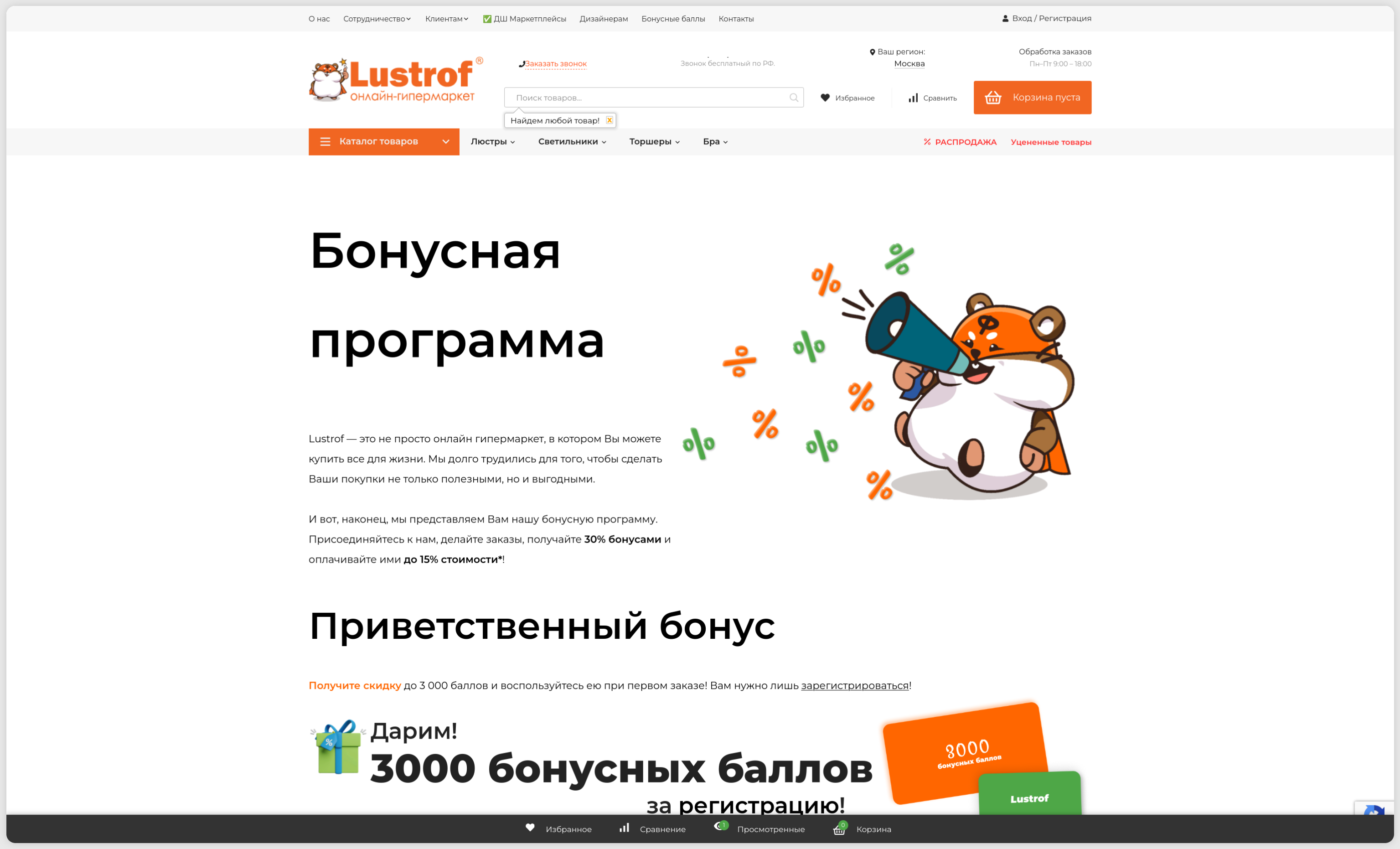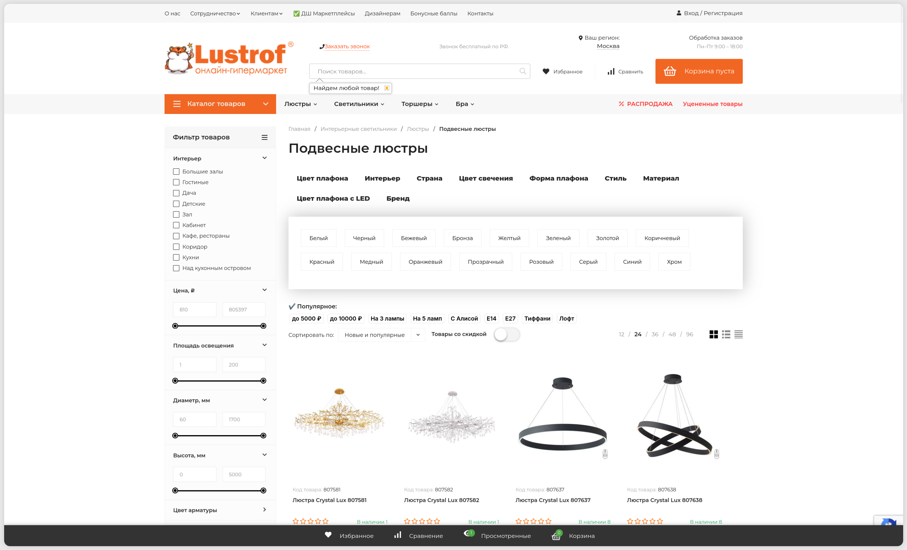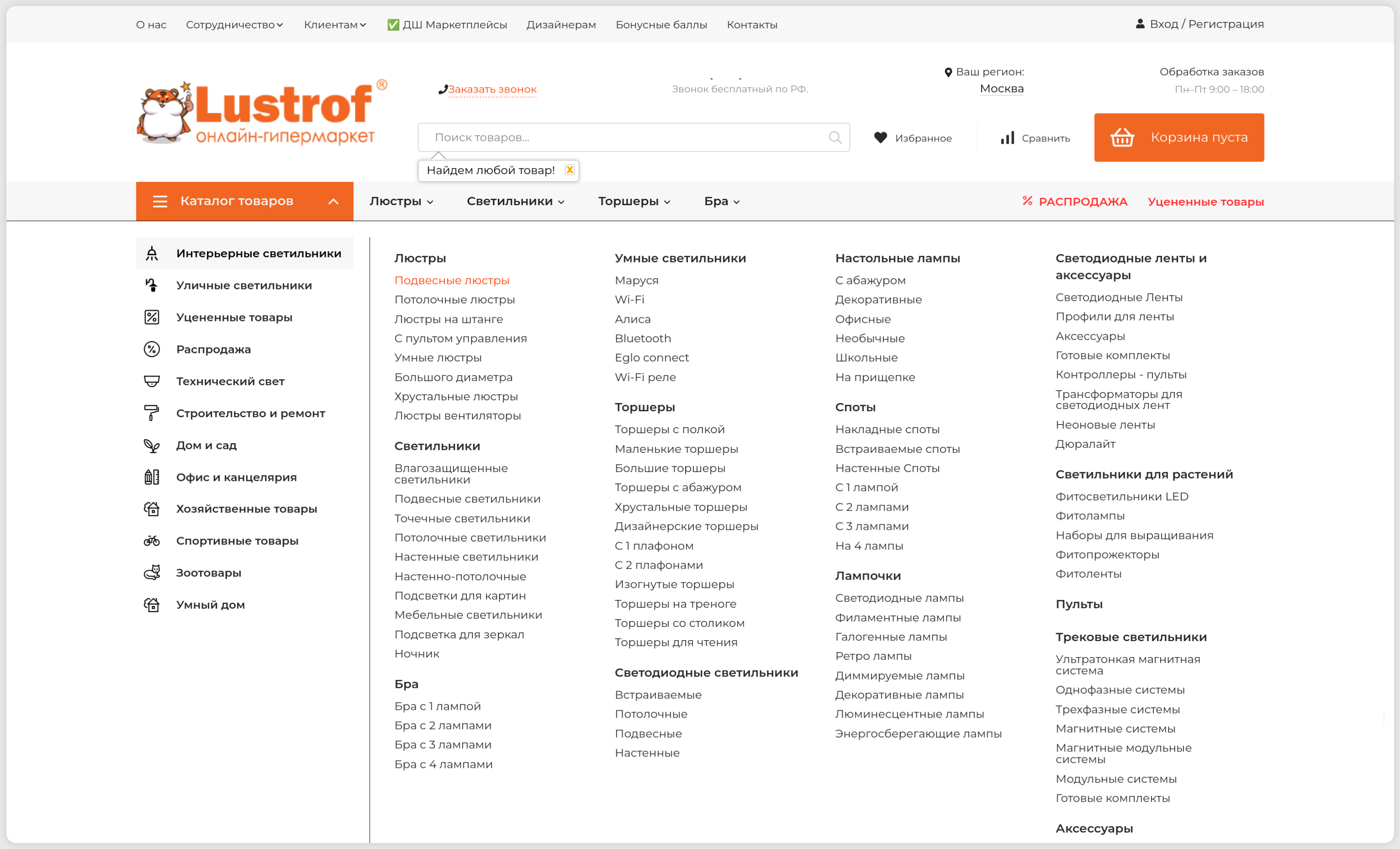 Онлайн-гипермаркет Lustrof - крупная площадка, специализирующаяся на продаже бытового и дизайнерского освещения, а также товаров для дома. Существует в Рунете с 2009 года, появилась на стремительно растущем рынке освещения в числе первых.