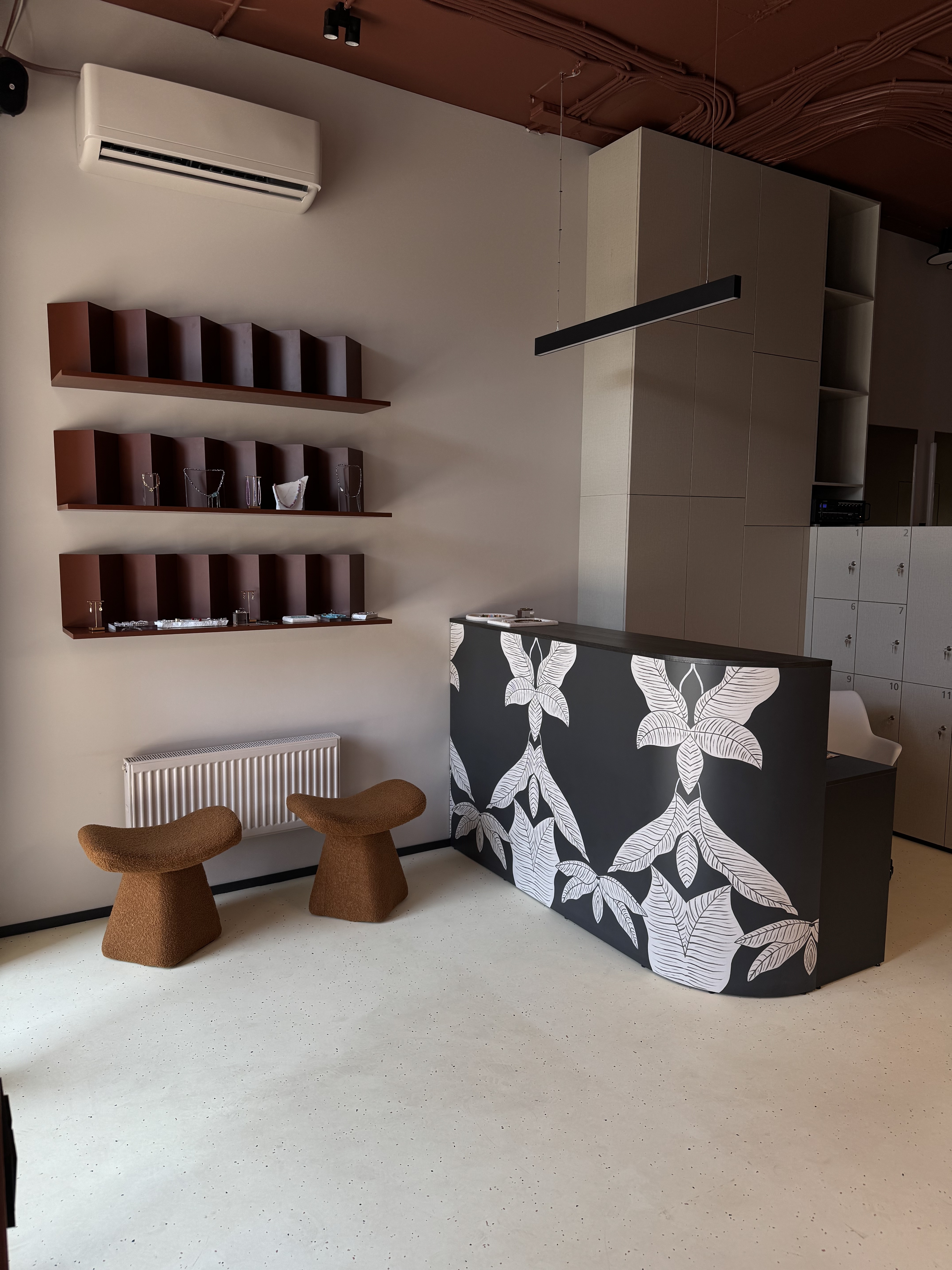 • планировка: зонирована под рабочие места мастеров, зону ожидания, ресепшен, складское помещение, своя кофейня;