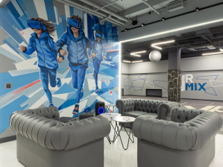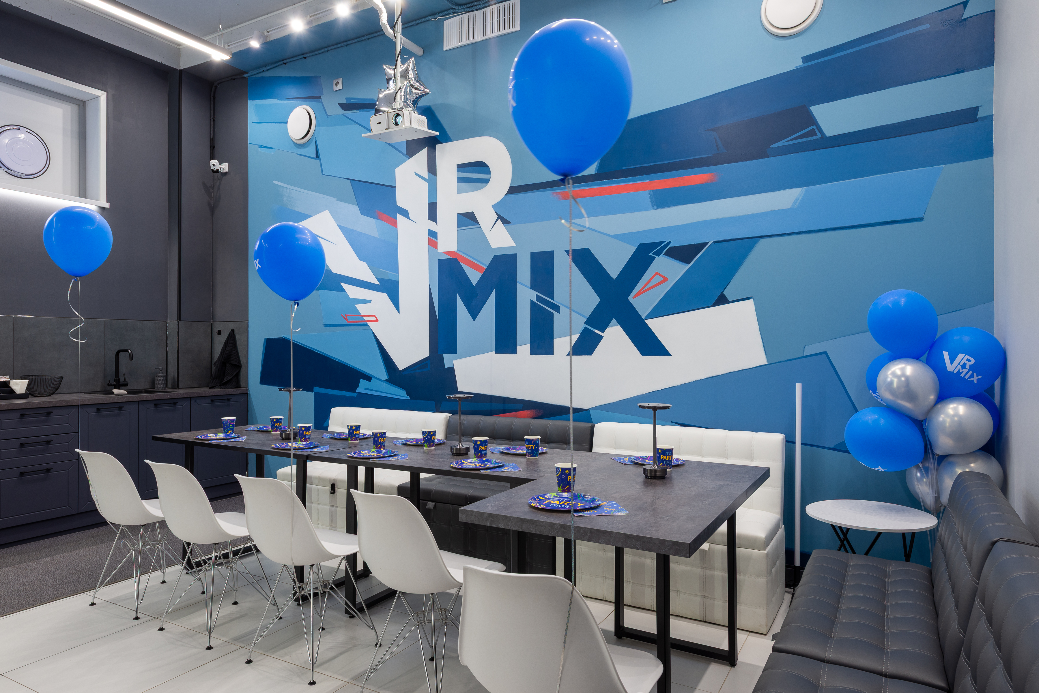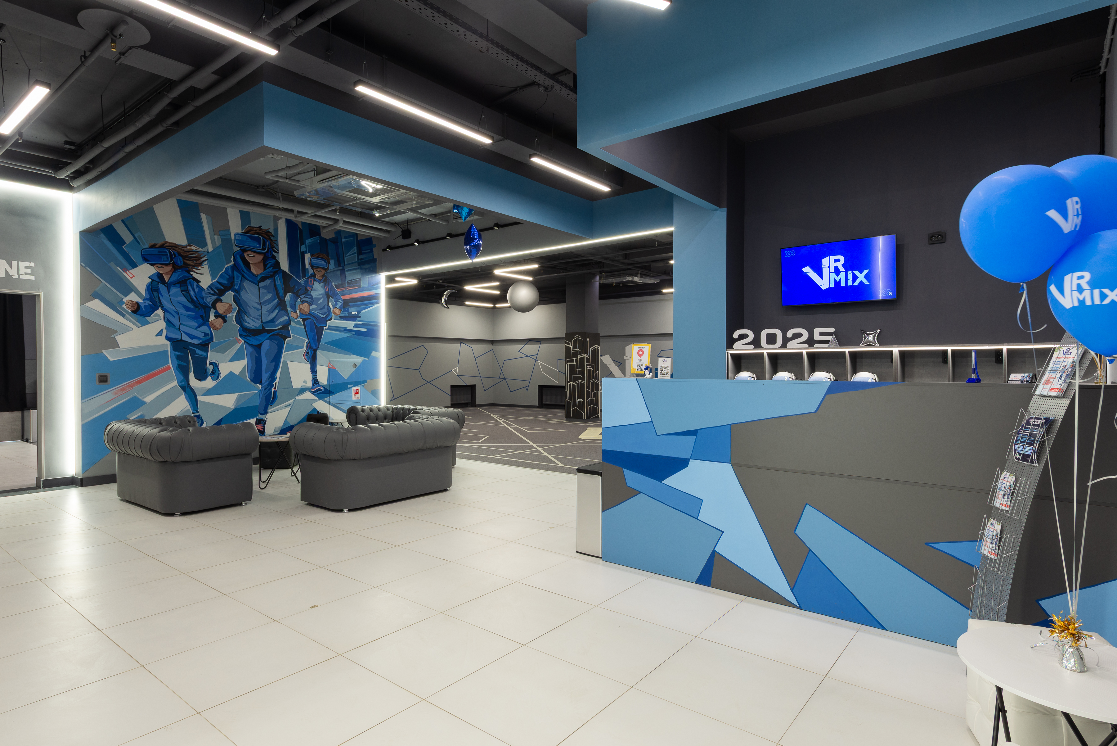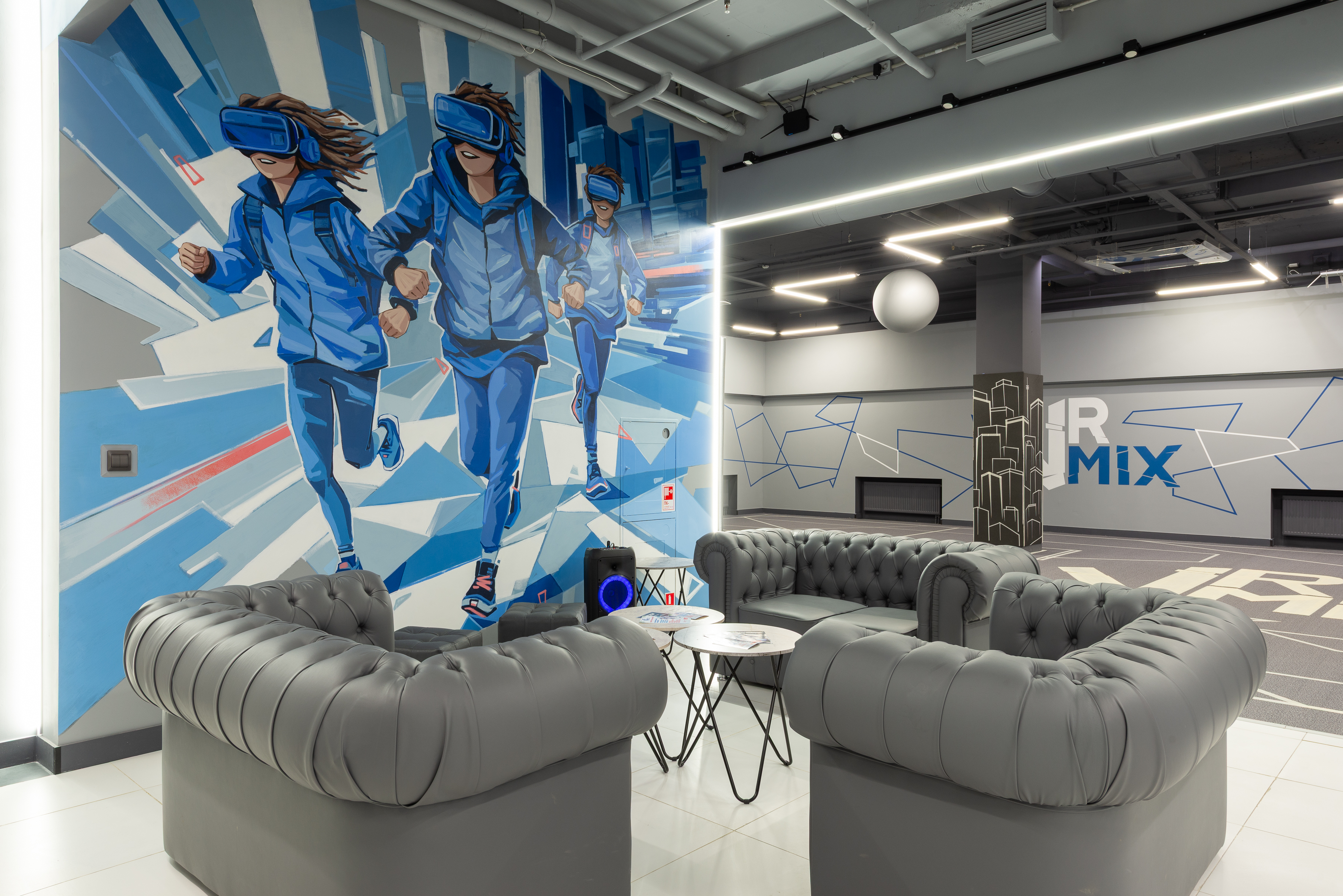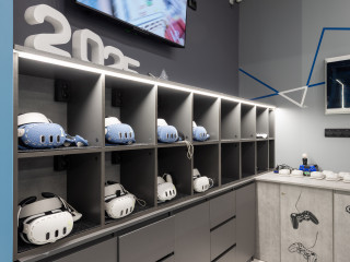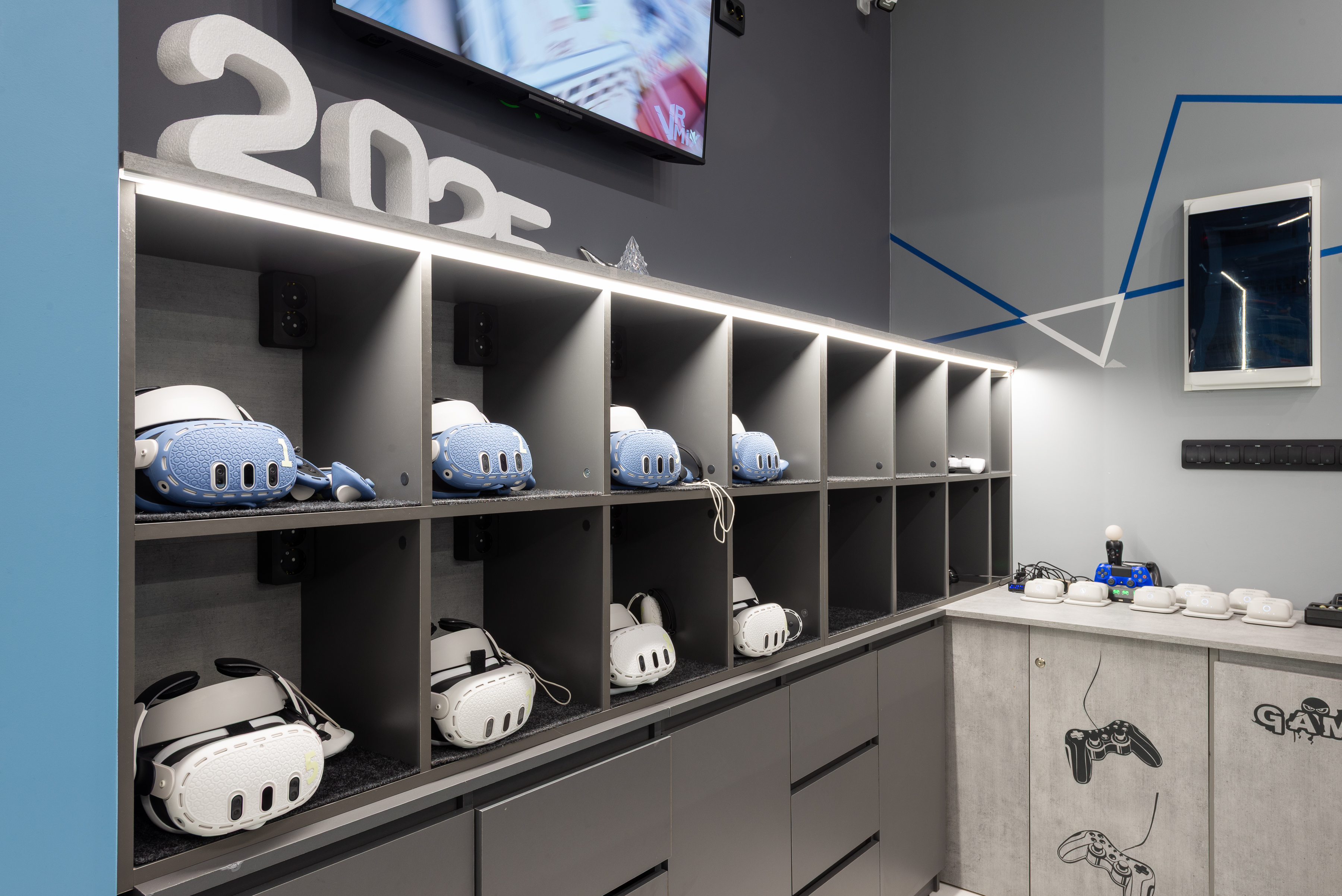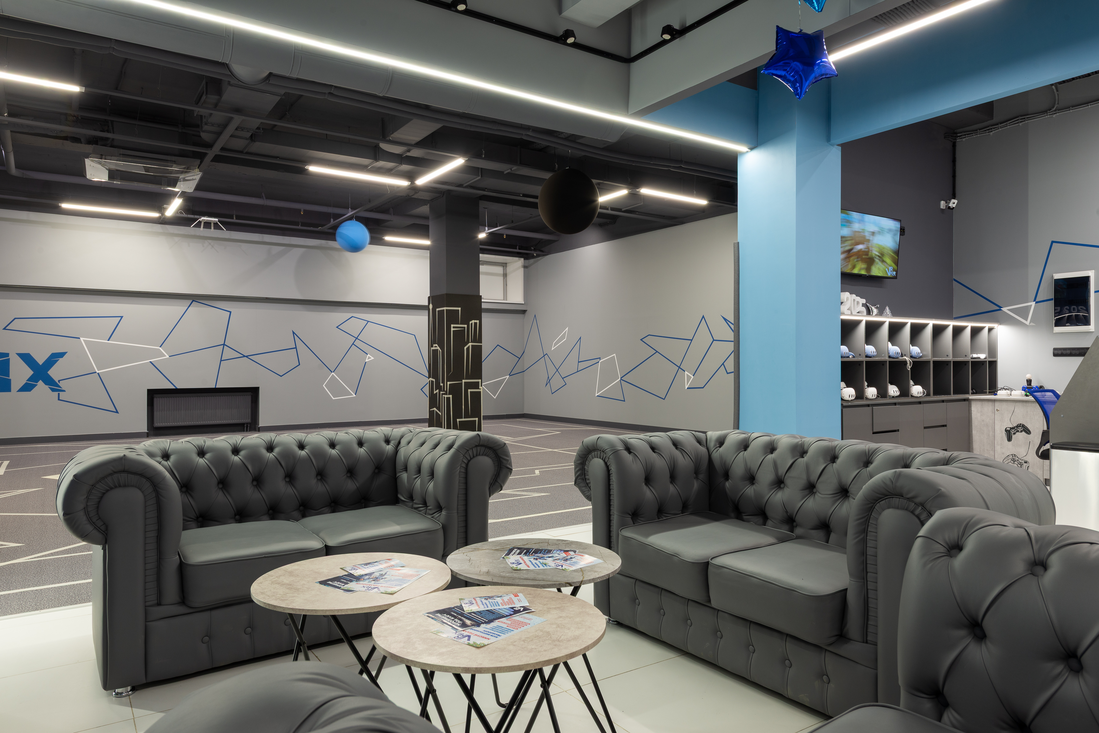 - Вся имеющаяся мебель: шкафы, диваны и стулья, столы и кофейные столики, кухонная мебель, стойка администратора, шкаф для хранения и зарядки шлемов виртуальной реальности.