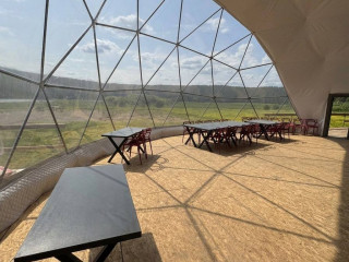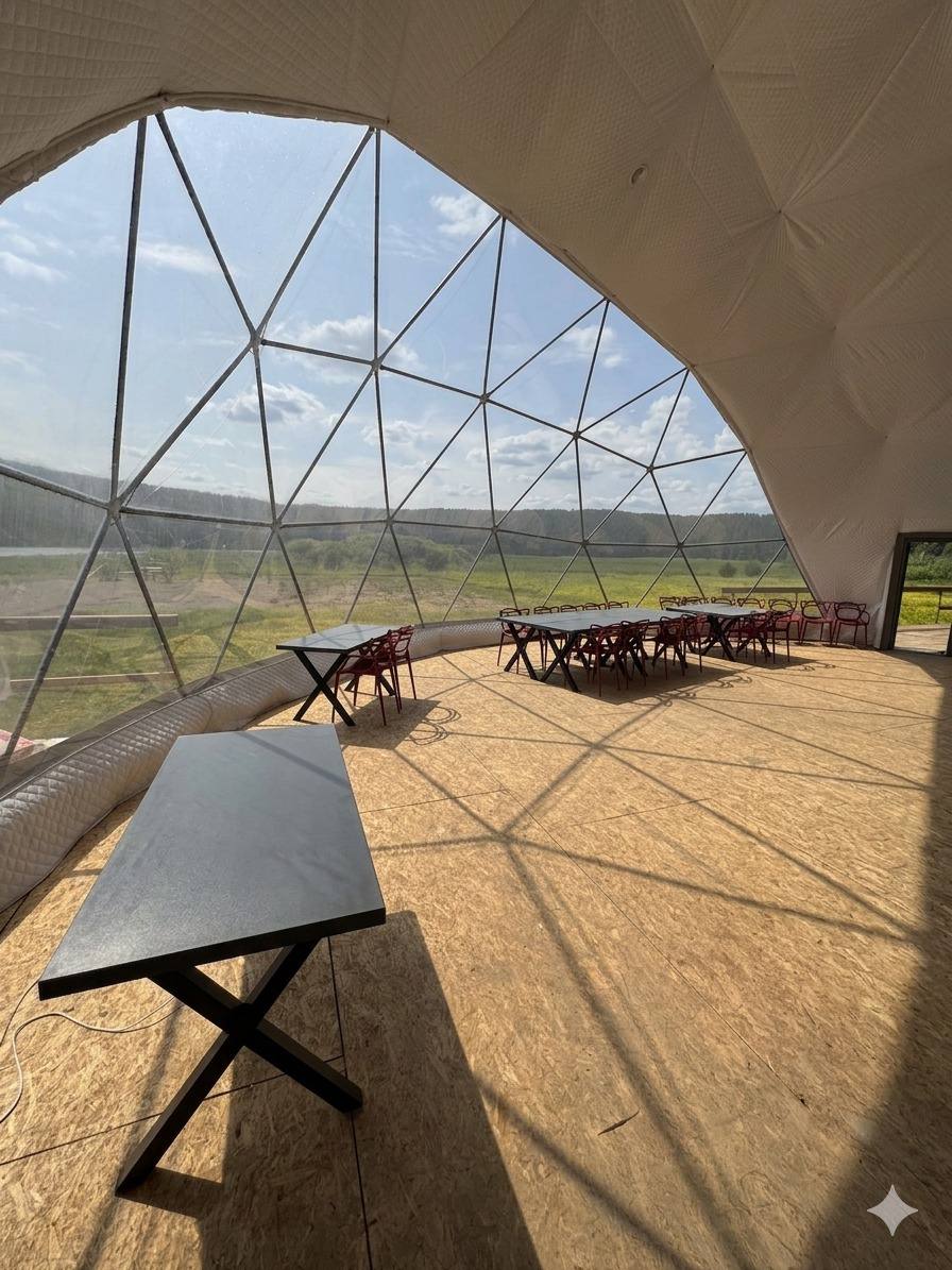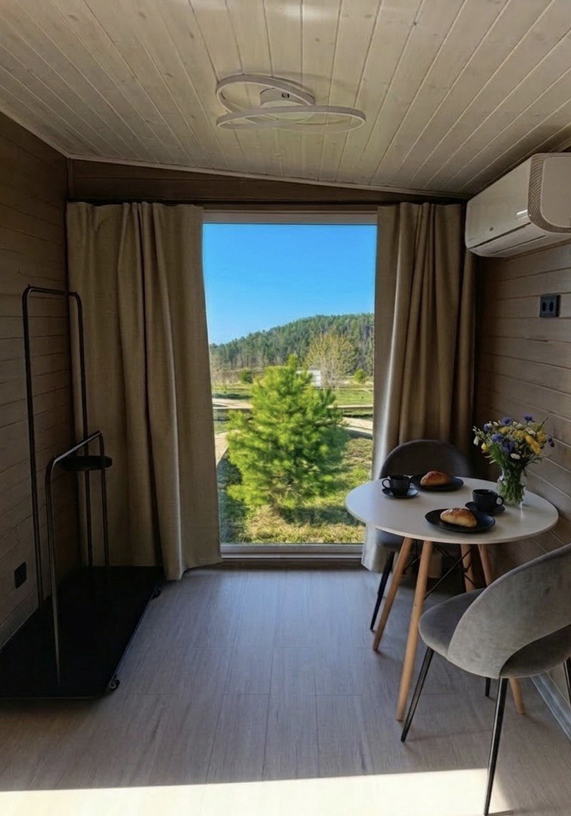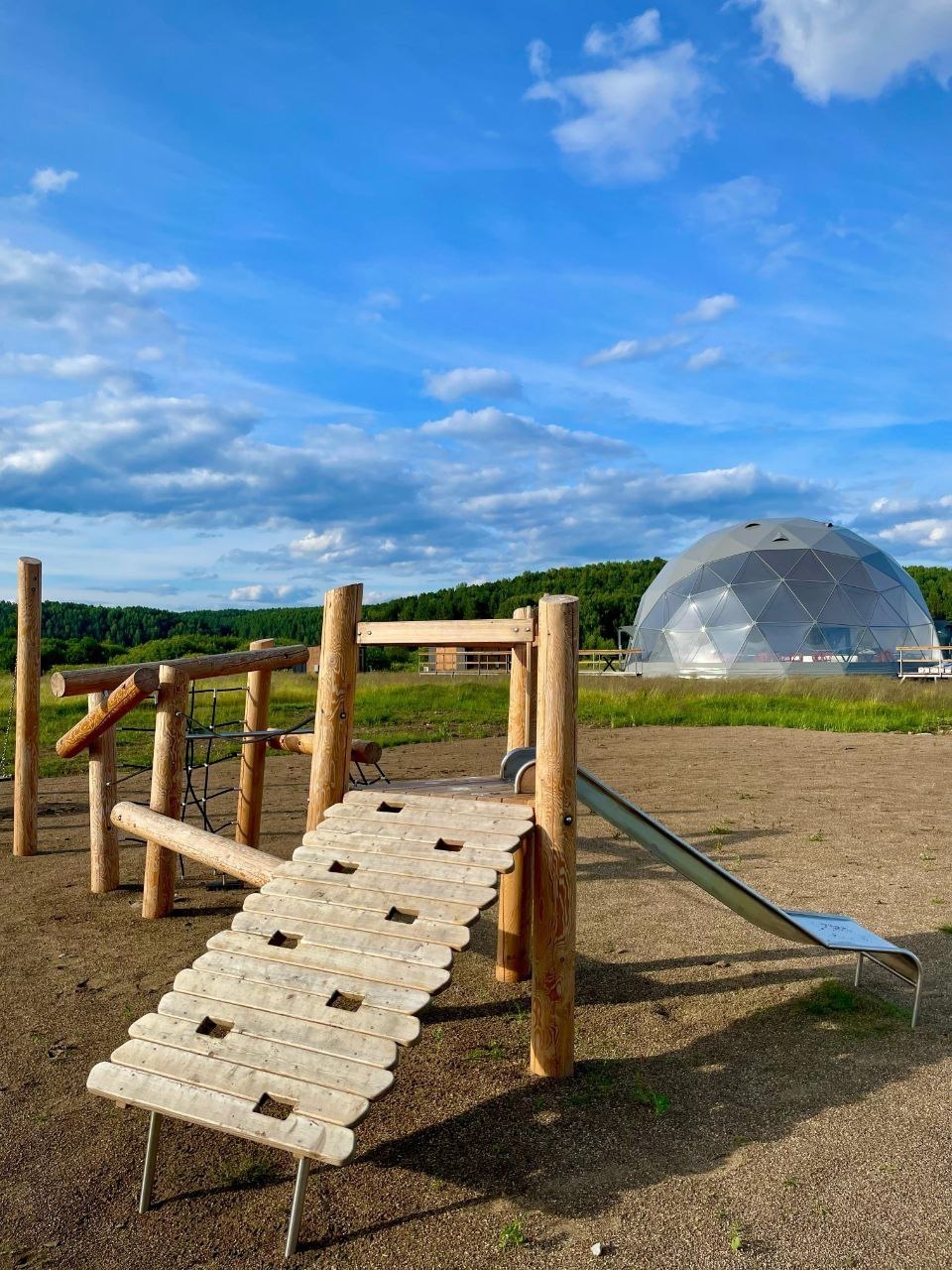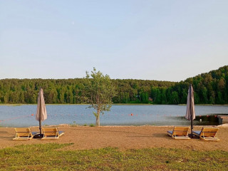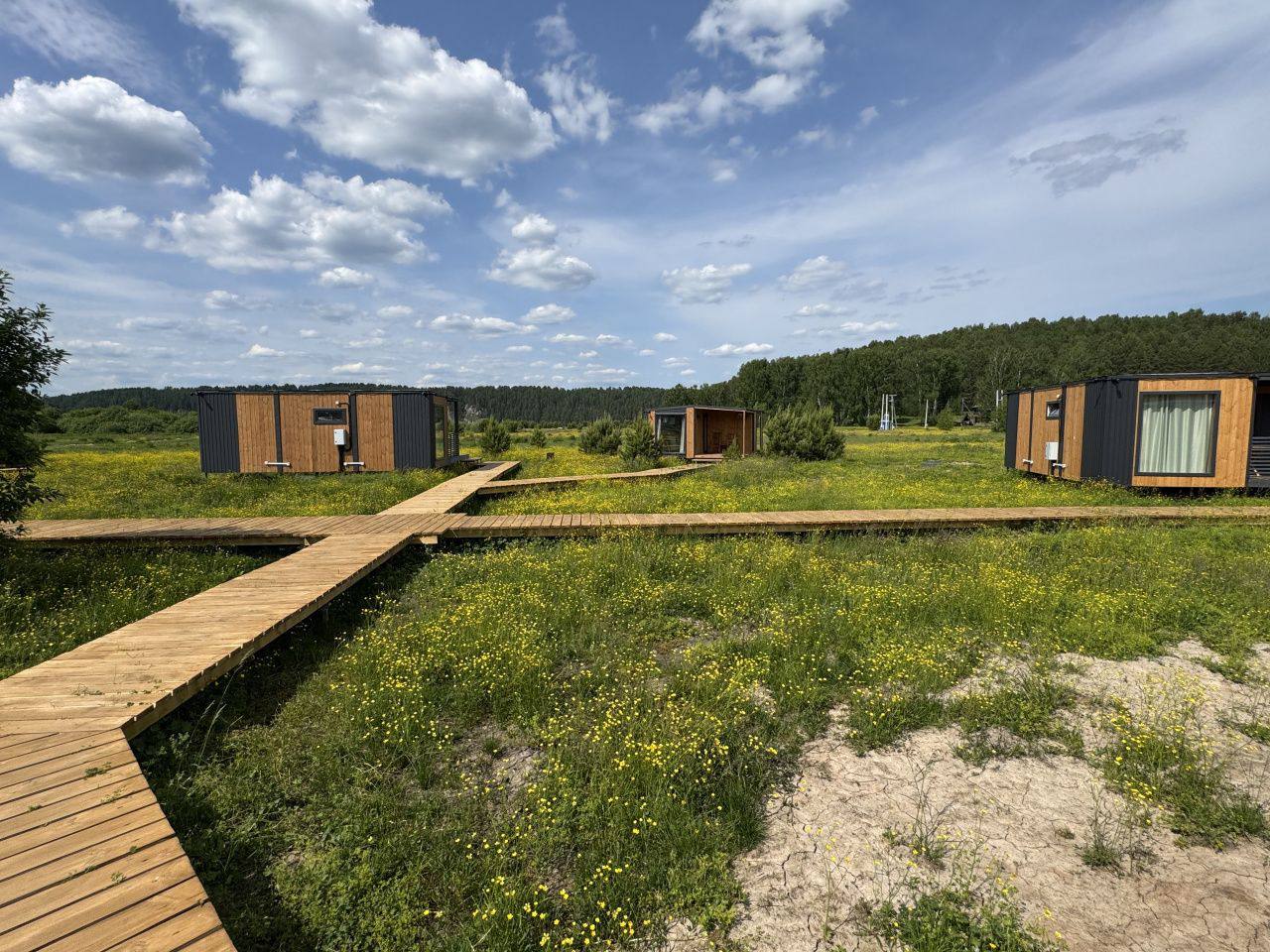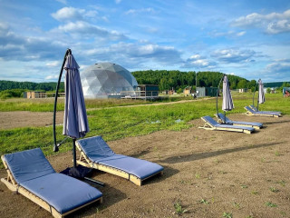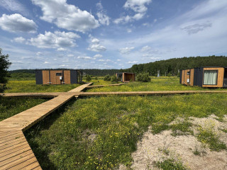 10 домов, полностью оснащённых всеми удобствами (электричество, септики, 2 скважины), на территории глэмпинга отельное кафе-шатер для проведения мероприятий, пляж, спортивная и детская площадки, душевые, туалеты.