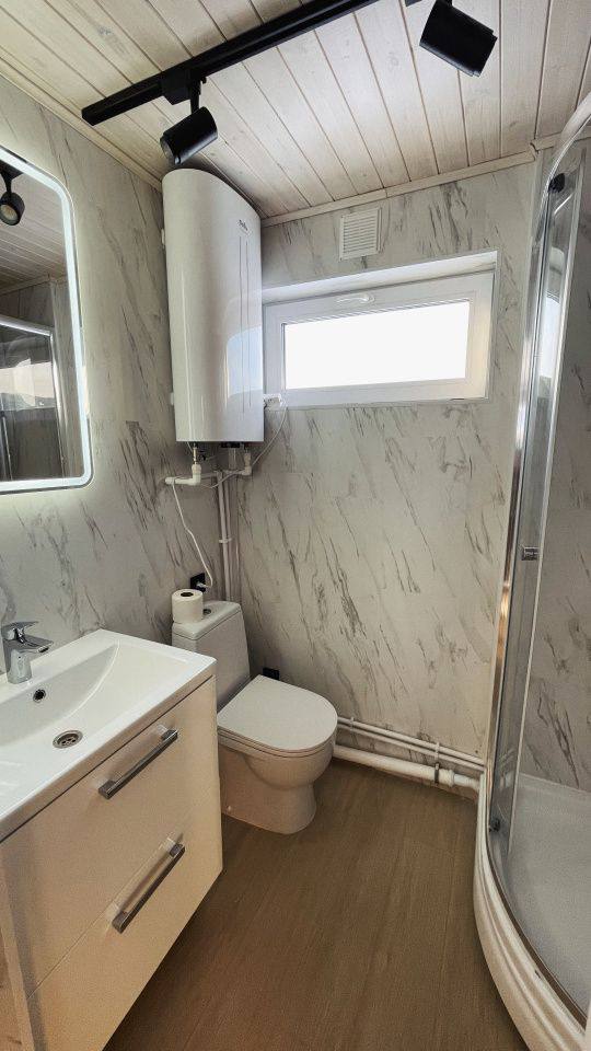 Полное оснащение: мебель, техника (холодильник, микроволновая печь, чайник, телевизор, конвекторы, кондиционеры), посуда, санузлы (унитаз, раковина, зеркало, душевая кабина, бойлер), уличная мебель.