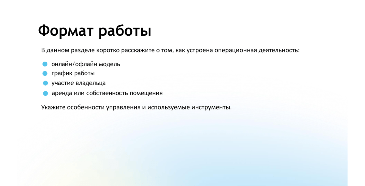 - Масштаб и ресурсы: площадь, сотрудники, оборудование, онлайн/офлайн