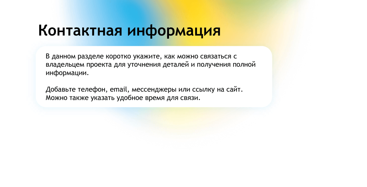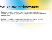 В объявлении не следует размещать внешние ссылки. Наша задача — предоставить инвесторам всю необходимую информацию непосредственно на портале. Этот подход удерживает внимание на вашем предложении, упрощая процесс принятия решений и ускоряя взаимодействие. - Отсутствие контактов