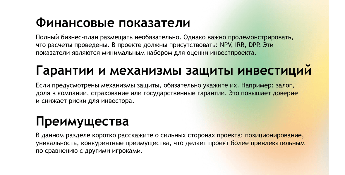 Следуя этим рекомендациям, ваш инвестиционный проект будет выглядеть профессионально, прозрачно и убедительно. Инвестору станет легче оценить ваши планы, прогнозы и надёжность — а значит, вероятность отклика и успешного привлечения средств значительно вырастет.