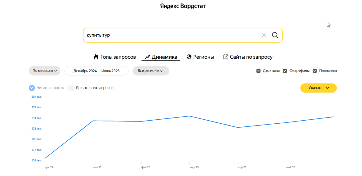 Количество запросов “купить тур” в Яндексе резко начинает расти с начала года. И с мая входит в высокий сезонный уровень до середины лета.