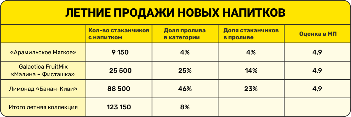 Алексей: Смена напитков – на этом абсолютно точно можно строить маркетинг нового направления «драфтуй». Просто говорить, что у нас самый вкусный драфт – не сильно рабочая тема, быстро приестся. А заведение новых напитков через смену коллекций – оказалось то, что надо. Живое доказательство: лимонад «Груша» уже много лет был в топе продаж каждое лето, а в этом сезоне его обогнал новый «Киви-Банан». Или «Галактика Вишня» всегда была самым продаваемым вкусом, но в это лето «Малина – Фисташка» опередила ее. «Арамильское Мягкое» тоже вошло в топ. То есть все сорта, которые у нас были заявлены в коллекции, вышли в топ-продаж.