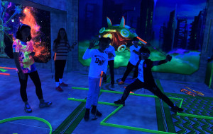 Это впечатляет и взрослого, и ребенка. Ведь все стены и полы наших игровых залов оформлены единым рисунком, который мало того, что светится нестандартно в неоновом свете, но еще расслаивается при использовании очков с линзами хромодепс. При этом, реальные дорожки для гольфа начинают парить над землей, драконы, космолеты и пришельцы просто оживают. И вы находитесь в этой нереально-реалистичной атмосфере на протяжении всей игры, которая занимает от 45 до 60 минут.
