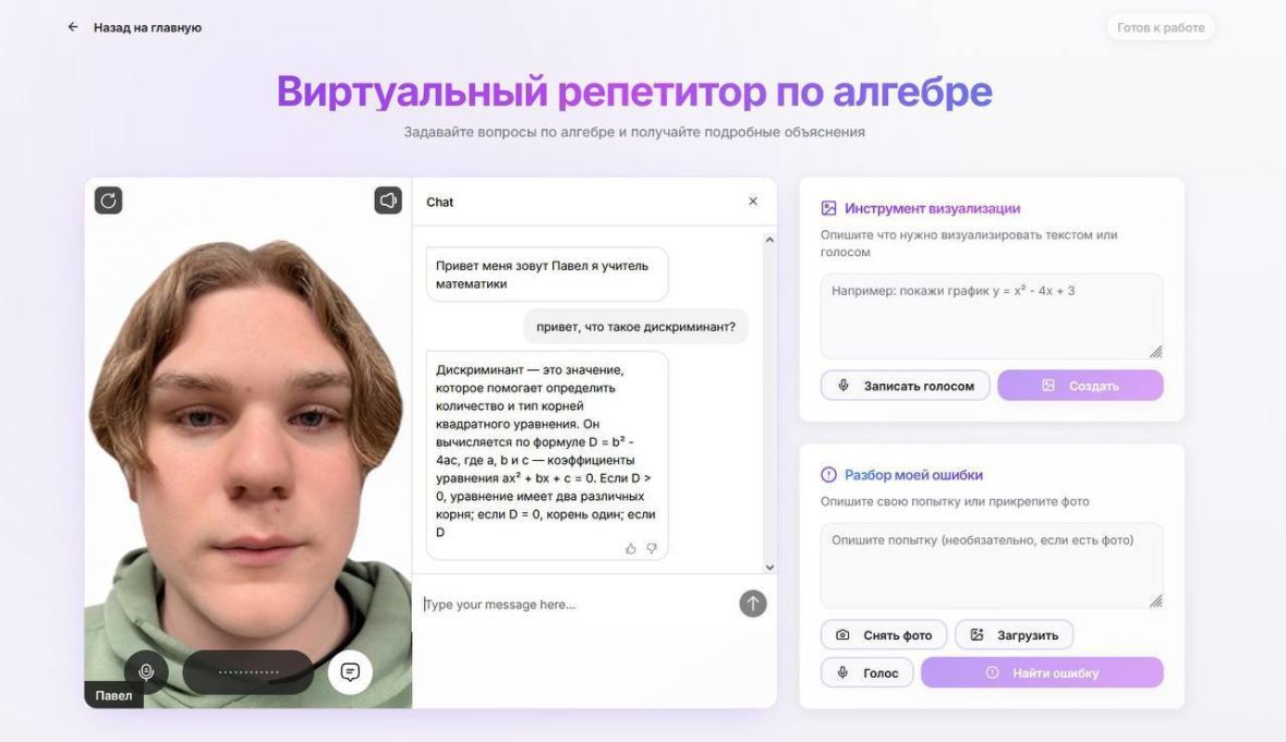 Особенность разработки – живой аватар, который общается с учеником, подстраиваясь под его запросы. Система умеет находить ошибки в рассуждениях и направлять к правильному решению.