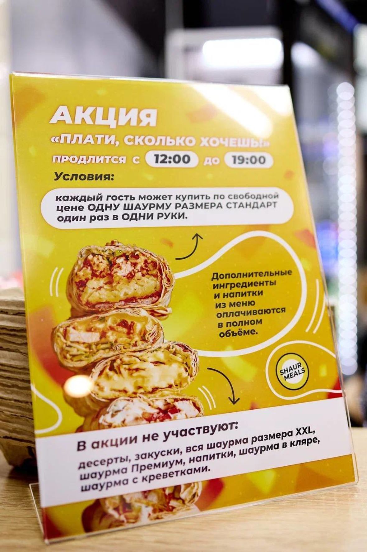 В день открытия была реализована акция «Плати, сколько хочешь». Такой формат Shaurmeals использует как отработанный маркетинговый инструмент для быстрого старта: он позволяет протестировать спрос, обеспечить высокий трафик с первого дня и сформировать «сарафанное радио» вокруг новой точки.