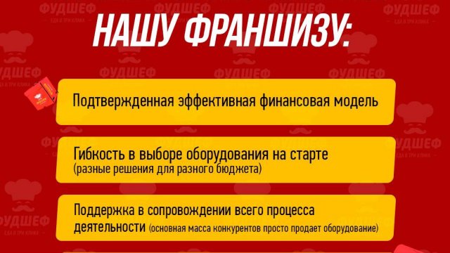 Выбирая франшизу «Фудшеф», вы получаете подтвержденную финансовую модель, возможность выбора соответствующего оборудования на старте, полную поддержку на всех этапах работы и огромный опыт в сфере общественного питания.