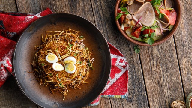 Фирменные хинкали (с мясом, грибами, сыром), свежую традиционную закуску пхали, ароматные оджахури, шкмерули, чашушули, сочные шашлыки на углях, восточные десерты и напитки.