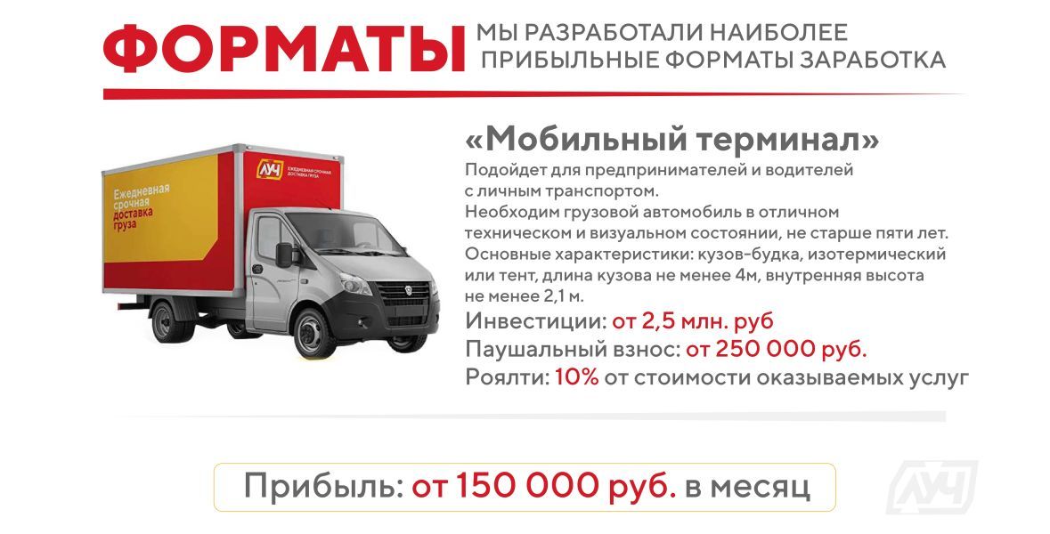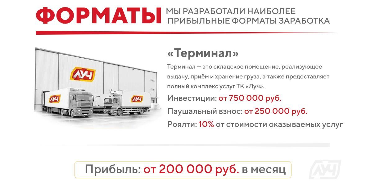 Франшиза транспортной компании «Луч» — это возможность открыть свой логистический бизнес под руководством федерального оператора с 12-летним опытом.