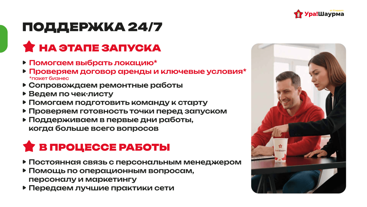 Франшиза обеспечивает полное сопровождение партнёра на всех этапах работы, включая обучение и поддержку команды.