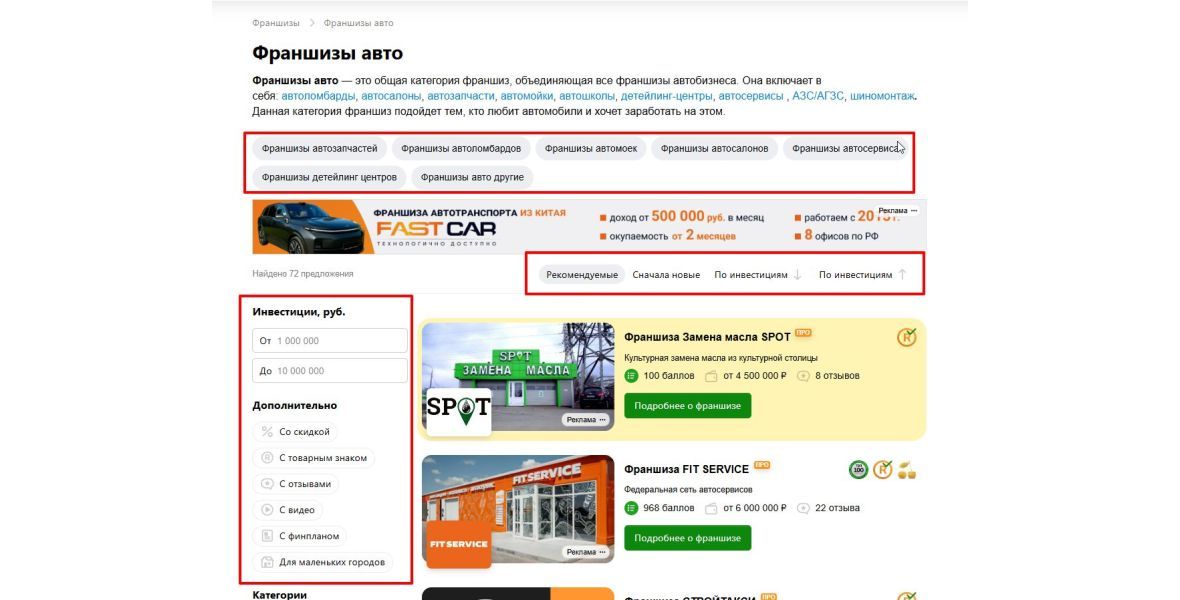 Помимо категорий, каталог помогает быстрее найти нужные объявления при помощи поисковой строки и фильтров (по отзывам, скидкам, товарным знакам, инвестициям и т.п.).