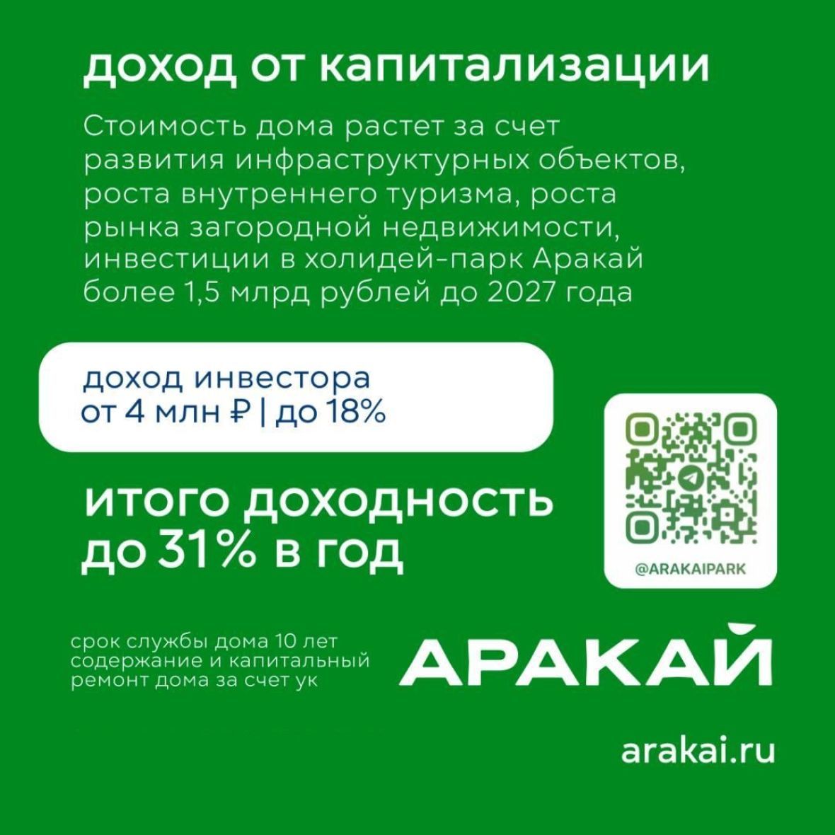 13-18 % годовых – доходность от аренды. Первые платежи с октября 2026 года сразу после запуска курорта в сентябре 2026 г. В случае более позднего старта предусмотрен минимальный доход 12 %. Выплаты ежемесячно, 50 % от всего арендного потока. Все затраты на возможные затраты включены в вознаграждение УК. Предполагается планомерный рост рентного дохода ввиду постепенного роста заполняемости и повышения цены