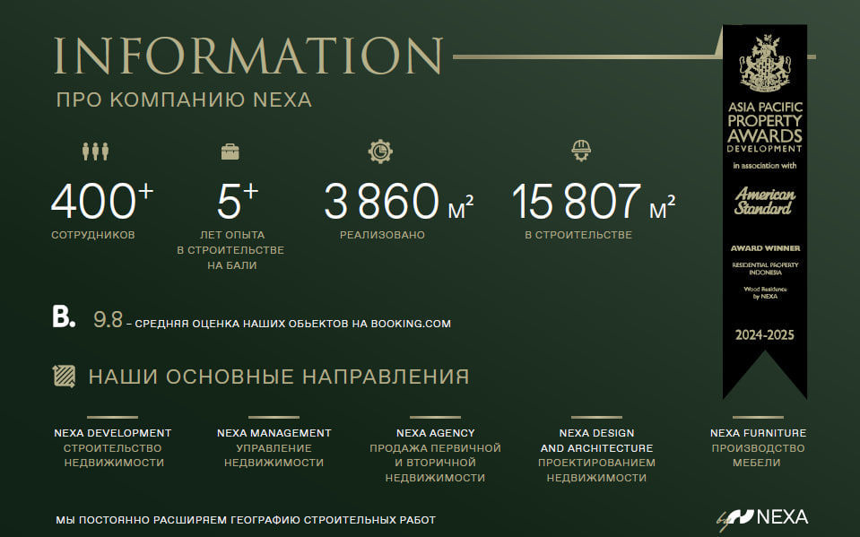 Целью привлечения инвестиций является финансирование строительства и приобретения премиальных объектов недвижимости в рамках проектов ROYAL OASIS COLLECTION на Бали. Компания NEXA, обладая более чем 5-летним опытом работы и командой из 400+ специалистов, реализует современные и экологичные комплексы, объединяющие высокий уровень архитектуры, комфорта и сервиса.