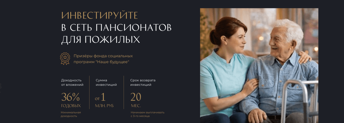 Наш принцип: Вы вкладываете средства один раз, а получаете доход десятилетиями. Пока наш пансионат заботится о пожилых людях, мы заботимся о ваших финансовых потоках.